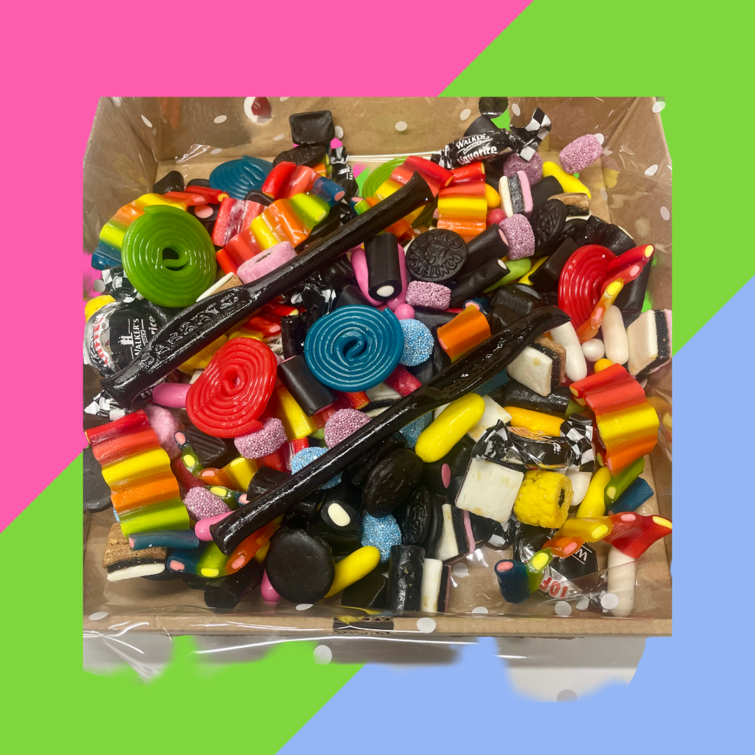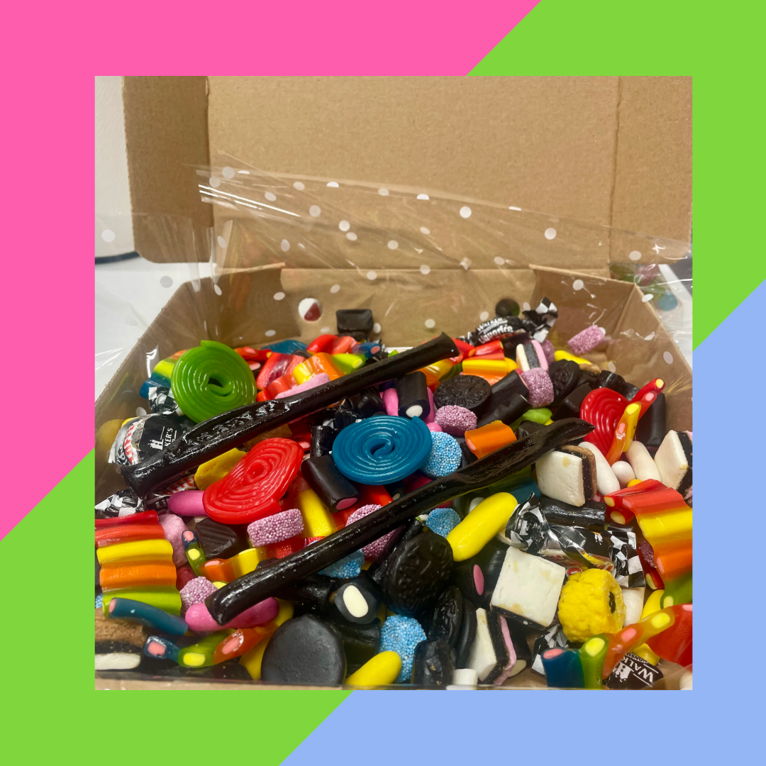 Indulge in our premium 1kg Liquorice Mix - a delightful assortment of traditional liquorice sweets presented in our signature pizza box packaging.
